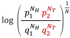 위 식에서 정규화를 위해 지수에 1/N (전체 동전을 던진 횟수)를 취해주고 log를 취해준다.