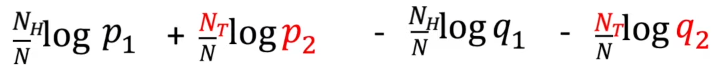 위 식과 같은 결과가 나온다. 만일 우리가 동전을 수없이 많이 던진다면, NH / N은 True Coin을 던졌을 때, 앞면이 나올 확률 p1에 수렴할 것이다. 같은 원리로, NT / N은 p2에 수렴할 것이다. 이를 반영하여 식을 새로 쓰면,