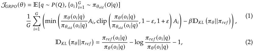 - 강확학습 알고리즘은 Group Relative Policy Opimization(GRPO)를 사용