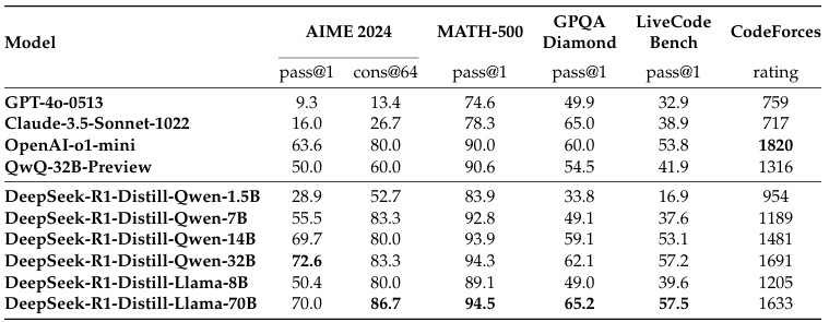 심지어 DeepSeek-R1-Distill-Qwen-7B은 GPT-4o-0513 모델에 비해서도 더 좋은 성능을 보여줌