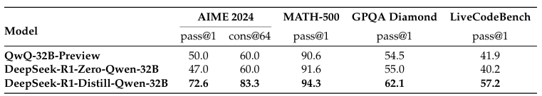 Distillation을 통해 학습된 모델은 모델의 파라미터에 비해 좋은 성능 (QwQ-32B-Preview vs DeepSeek-R1-Distill-Qwen-14B)