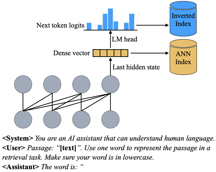 - last hidden state가 LM head를 통과하면 vocab 차원의 분포를 얻을 수 있고, 이를 활용하여 sparse representation으로 활용