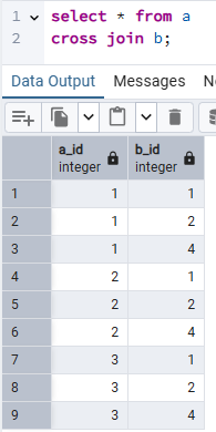본 예제에서는 각 테이블의 행이 3개씩이므로, 3 * 3 = 9개의 행을 가지는 테이블이 리턴된다.