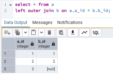 하지만, outer join을 했을 때는 a_id = b _id 인 경우가 없더라도 b_id 값을 null 값으로 채운 테이블을 리턴한다.