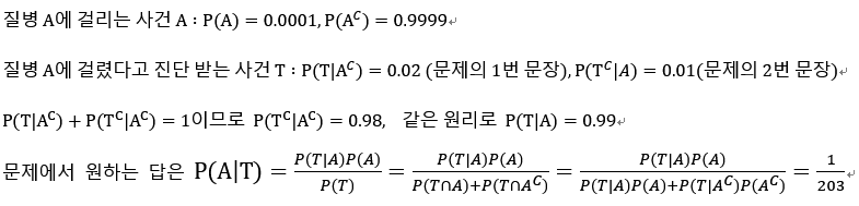 2) 어떤 사람이 A질병에 걸렸을 때 A질병에 걸리지 않았다는 검사 결과가 나올 확률은 1퍼센트이다.