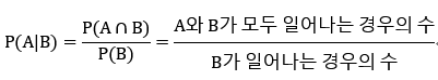 표본 공간 S에서, 사건 A와 B가 있을 때, 사건 B가 일어났다는 가정하에 사건 A가 일어날 확률을 말한다.